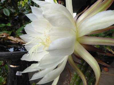 Then to our night flowering cactus. I showed you the bud last week. It comes into bloom in the evening and lasts a day. It is huge (seven or eight inches across), delicately scented and beautiful. So here is the progression. Today it is looking a bit sad - but there are other buds coming on.